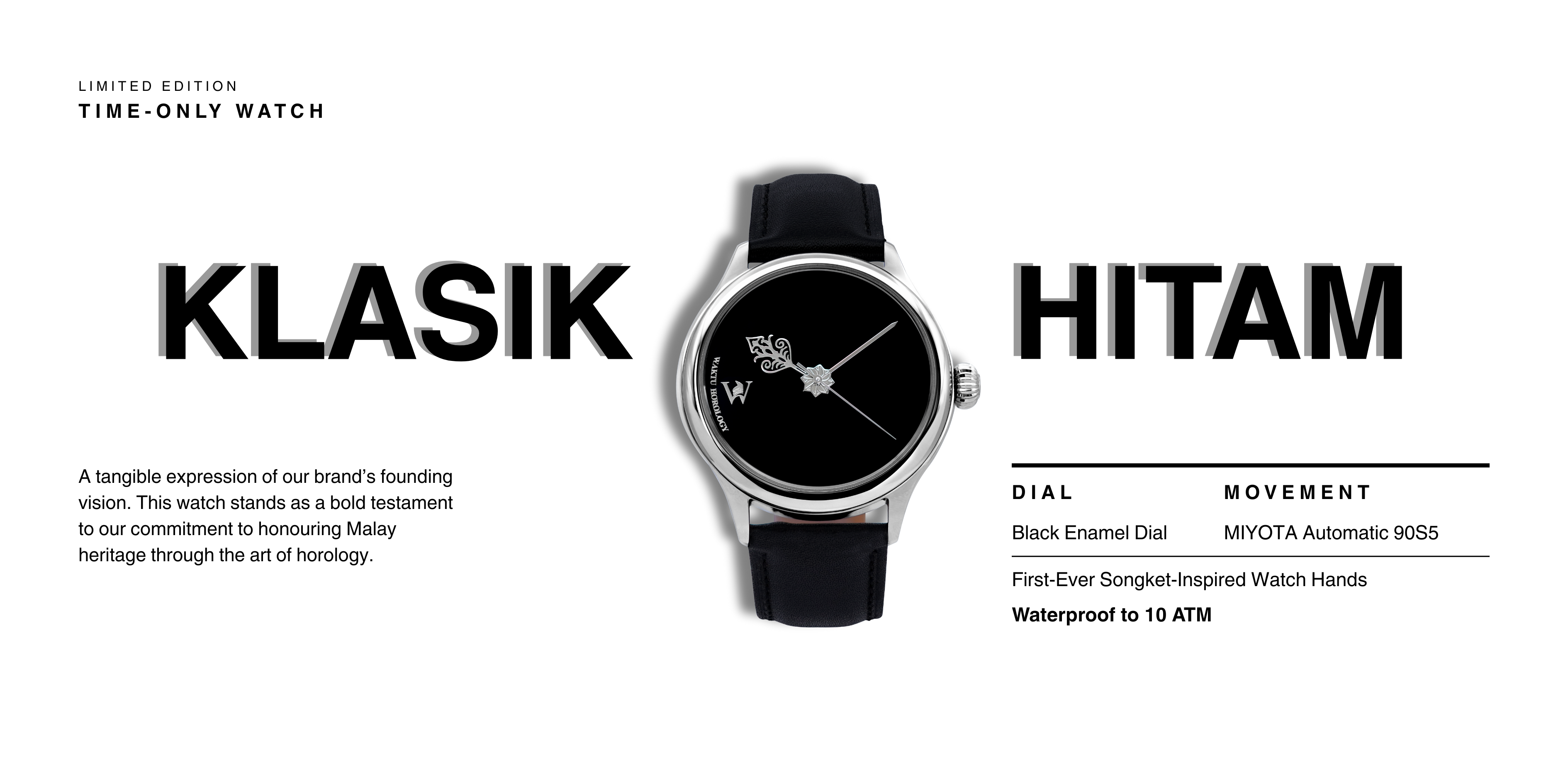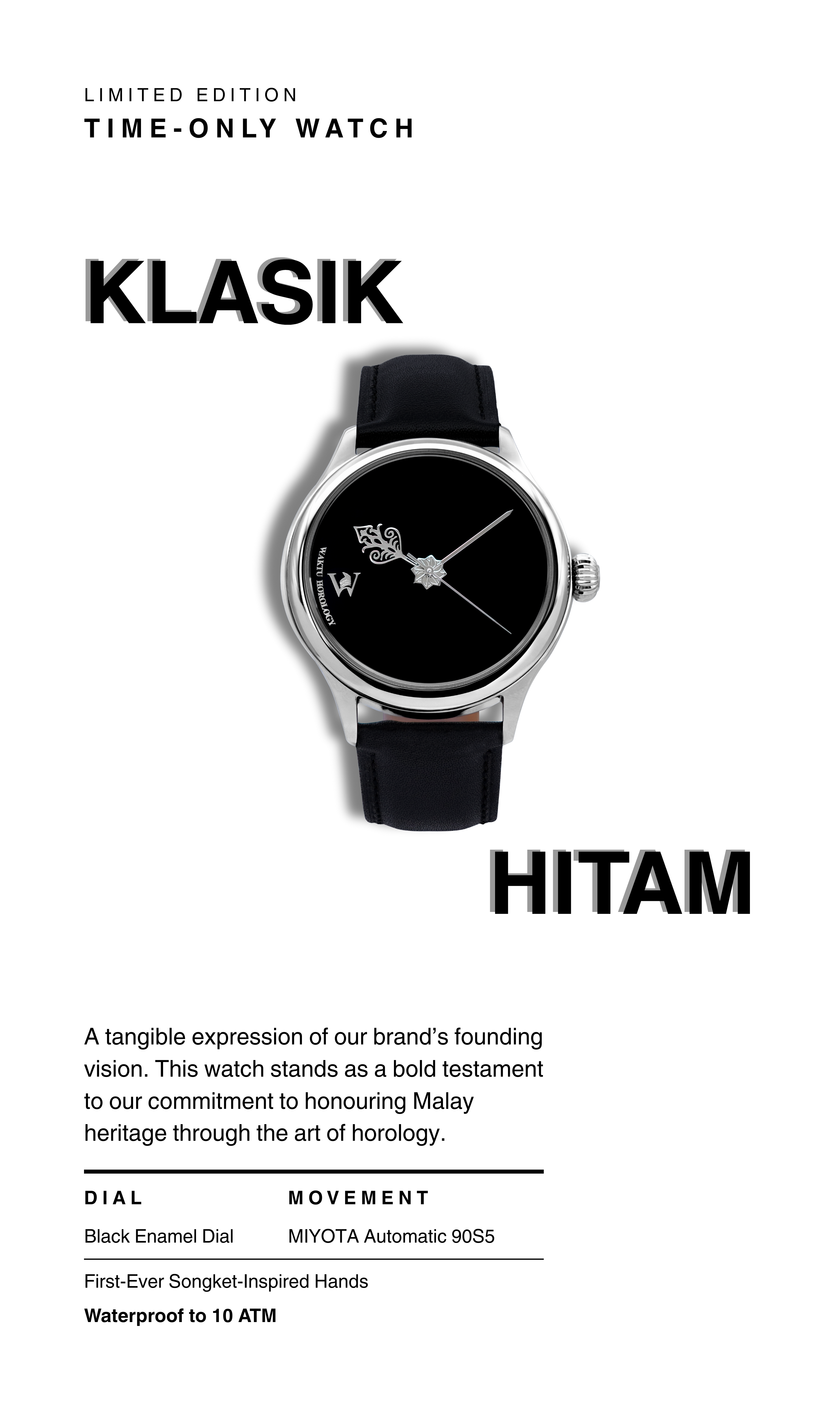 Introducing the Klasik: Hitam, Waktu's inaugural timepiece—a harmonious blend of timeless elegance and cultural heritage. This debut creation is more than a watch; it is a narrative woven into the very fabric of timekeeping.