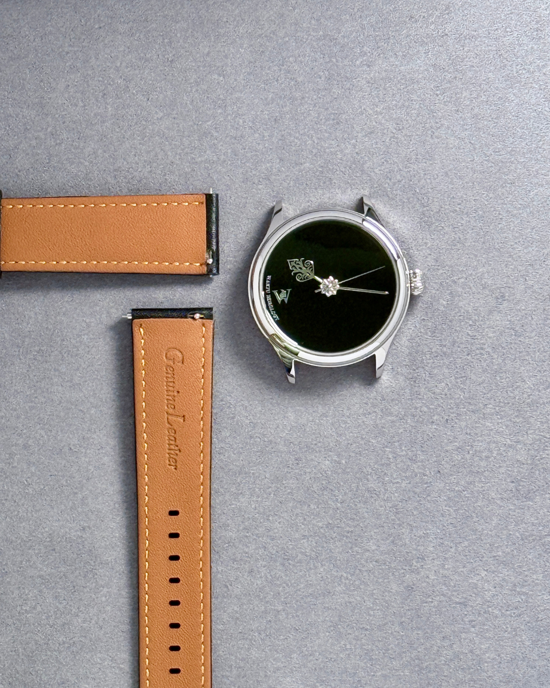 Waktu Horology's standard black leather strap is crafted from durable, genuine stitched cowhide leather. This standard strap is designed for comfort, longevity, and a classic look.
